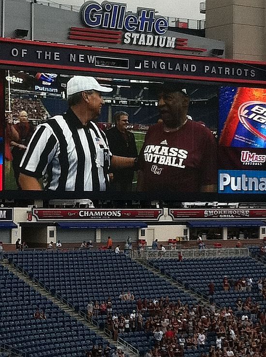 9-8-12 For opening home season UMass Alumni Bill Cosby tossed the coin and from Westover Air Base a UMass Alumni pilot flew a HUGE C-5 over the stadium at low altitude. Many news stations wondered if it was crashing !