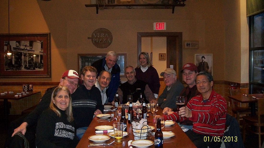 1-5-13 After UMBB game Bertucci's repast. L-R Denise Cammarata, Jay Cammarata, Dana White, Ed Dilorenzo. Bill Spierdowis, Vin Grandonico, Sandy Spierdowis, Stan Kittredge, Lloyd Bristol, Danny Lew. Rich Cook showed up 3 minutes later!! and Kevin O'Reilly showed for the BB game but no photos.